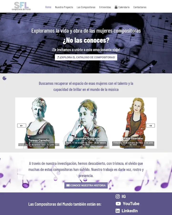 Compositoras del Mundo es una plataforma dedicada a documentar, visibilizar y difundir el legado y la creación de mujeres en la composición musical a nivel global. El sitio web centraliza y expande su ecosistema digital, integrando sus iniciativas en redes sociales y canales audiovisuales para ofrecer un recurso educativo y cultural accesible que celebra la diversidad en la creación musical.
